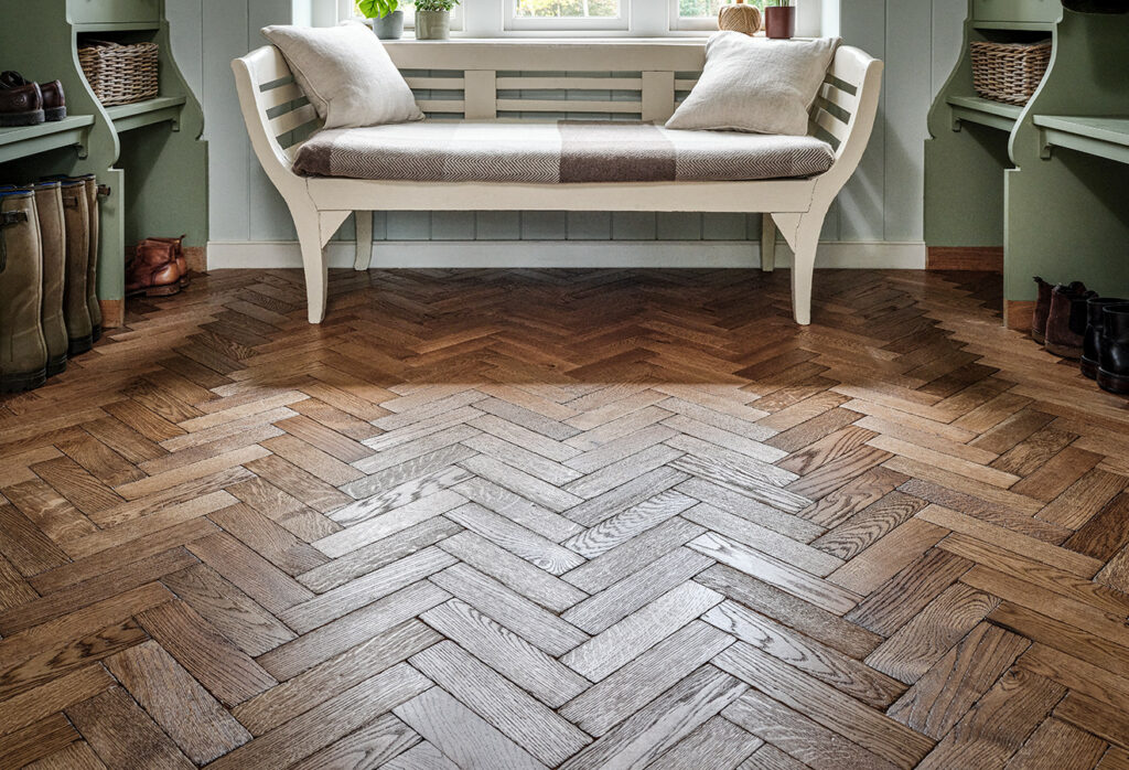 Richly textured vintage oak parquet floors in a spectrum of timeless shades